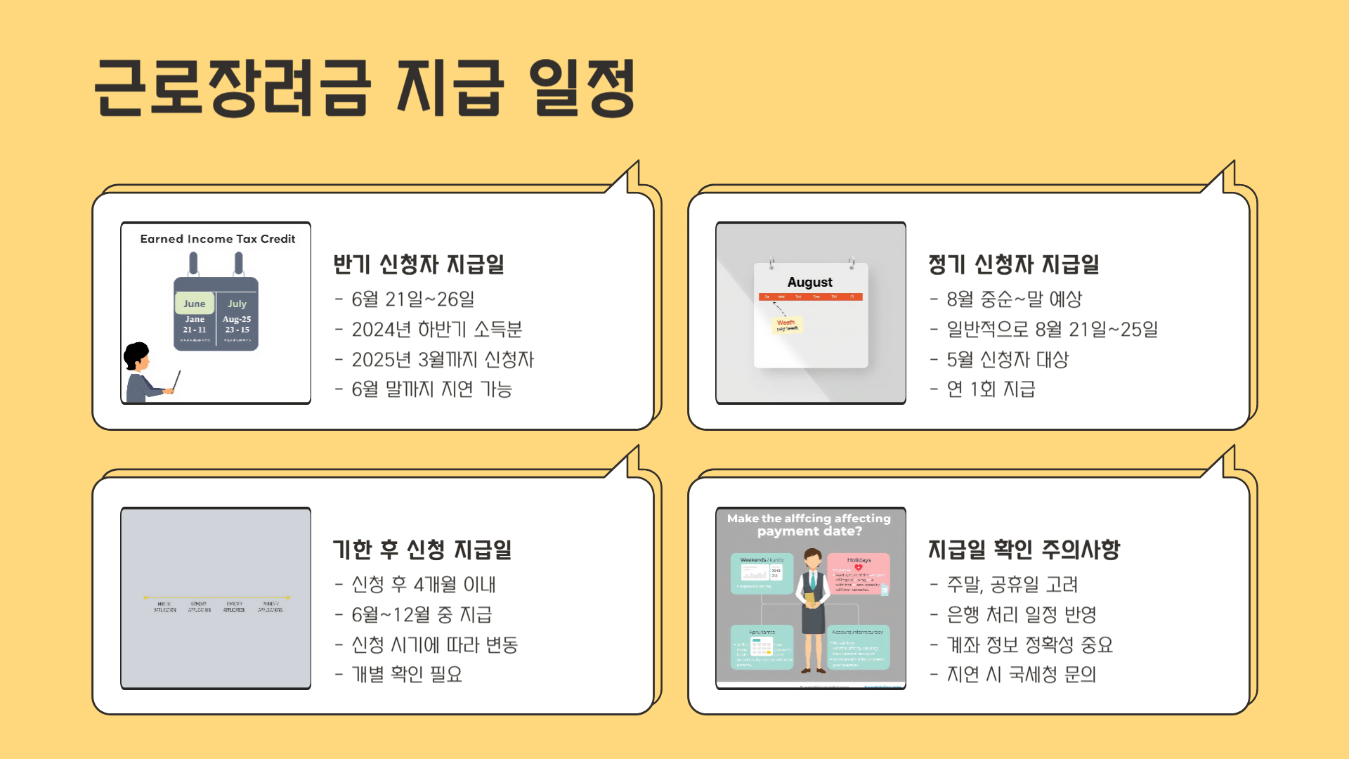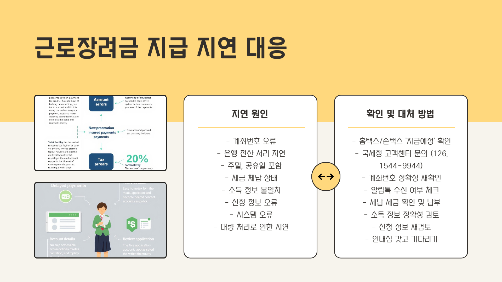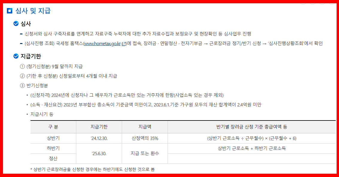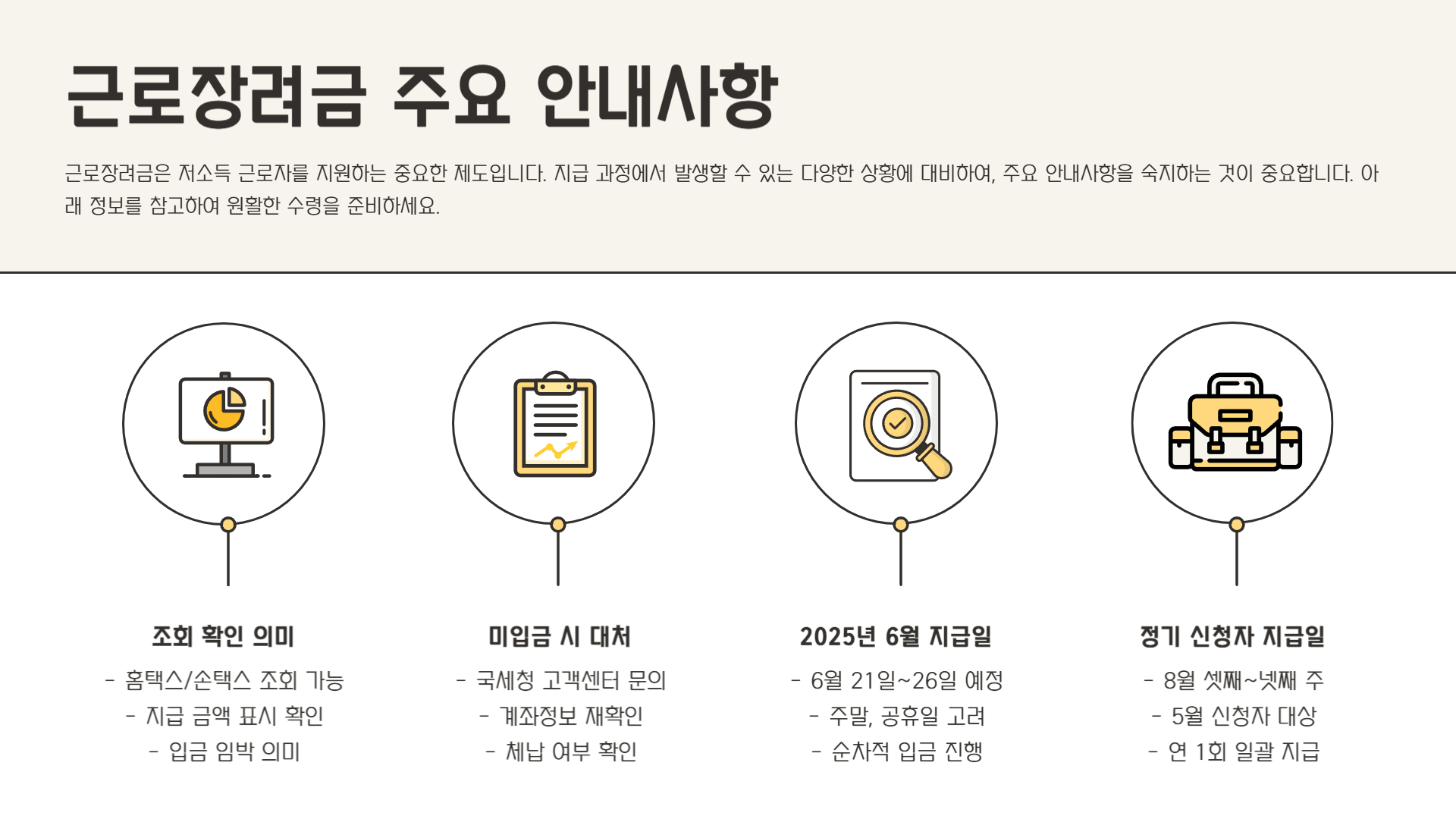 💡 근로·자녀장려금 내용 중 지급일은 국세청 일정에 따라 다소 조정될 수 있으니 신청 후 홈택스에서 상태 확인이 필요합니다.