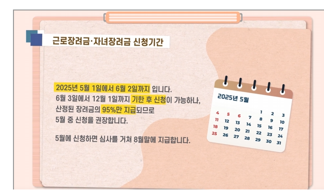 신청 기간은 2025년 5월 1일부터 5월 31일까지입니다. 근로장려금 신청자격이 있는 분이라면 이 기간 내 꼭 신청해야 합니다.