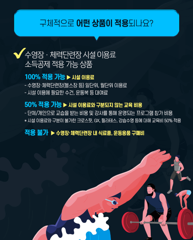 이제는 헬스장과 수영장 이용료까지도 소득공제가 가능하도록 확대되었습니다.