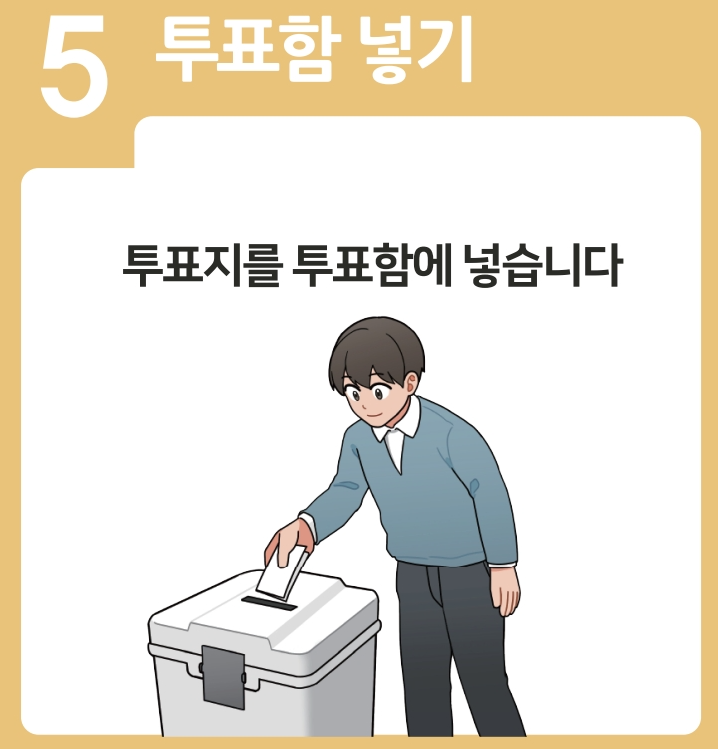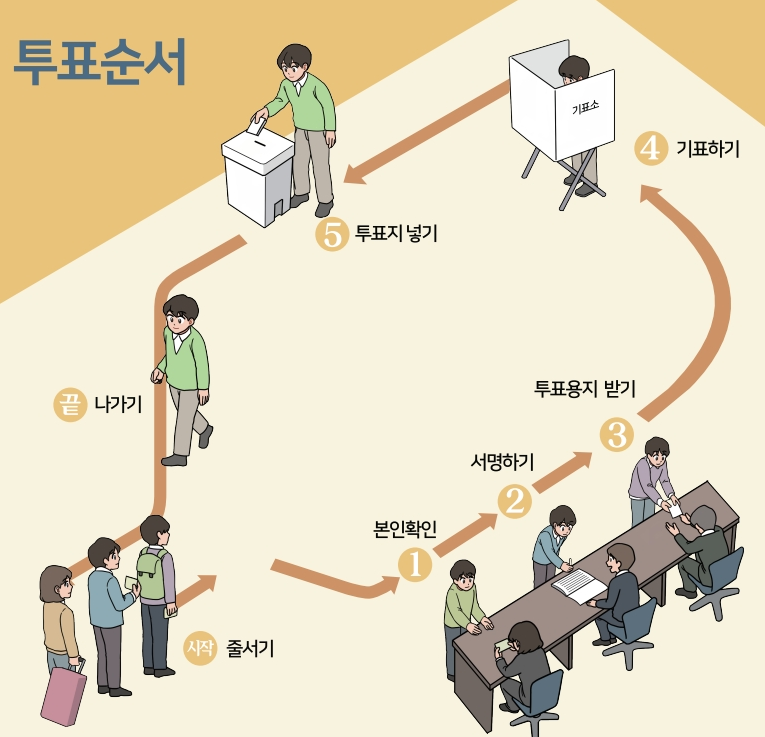 신분증 제시 및 본인 확인 | 투표용지 수령 | 기표소 내 용구로 기표 | 투표지를 투표함에 넣고 퇴장 |