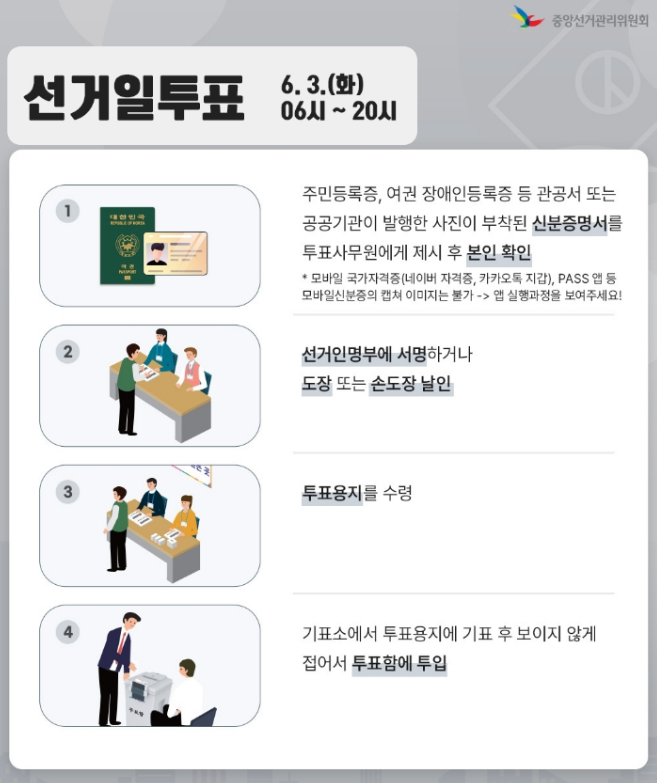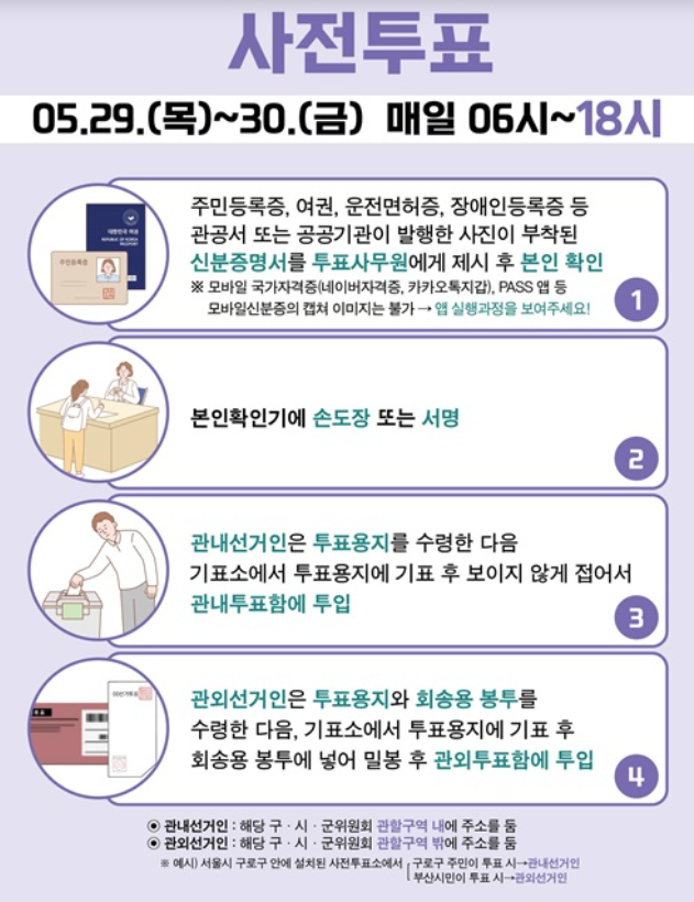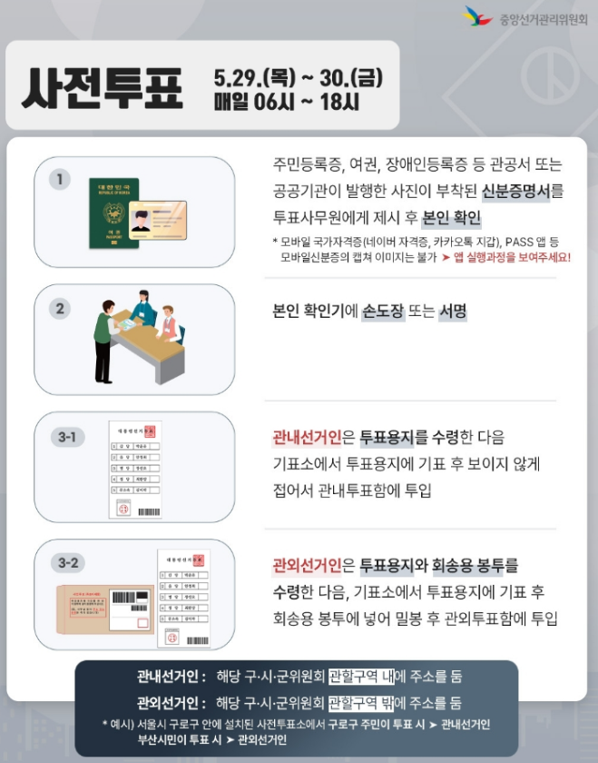 - 사전투표 방법: 장소 확인 → 신분증 지참 → 기간 내 방문