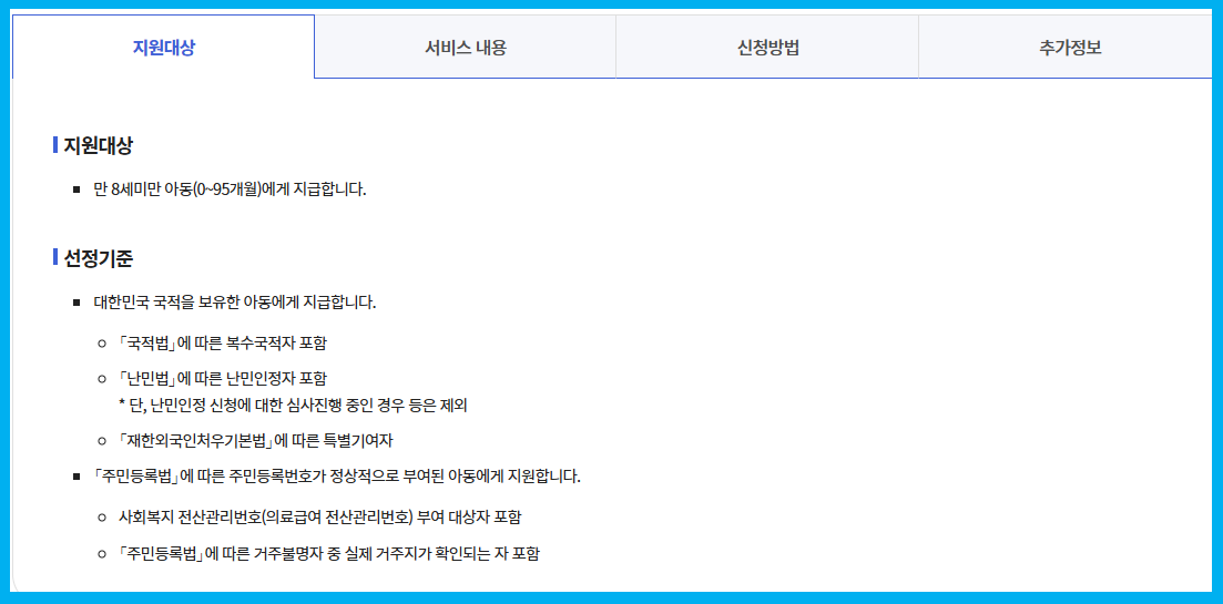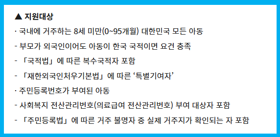 | 지급대상 연령 | 만 0세 ~ 만 8세 미만 | 만 0세 ~ 만 18세 미만 |
