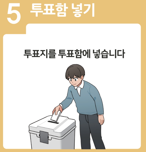 - 천천히 투표용지를 들고 나와 투표함에 넣습니다.