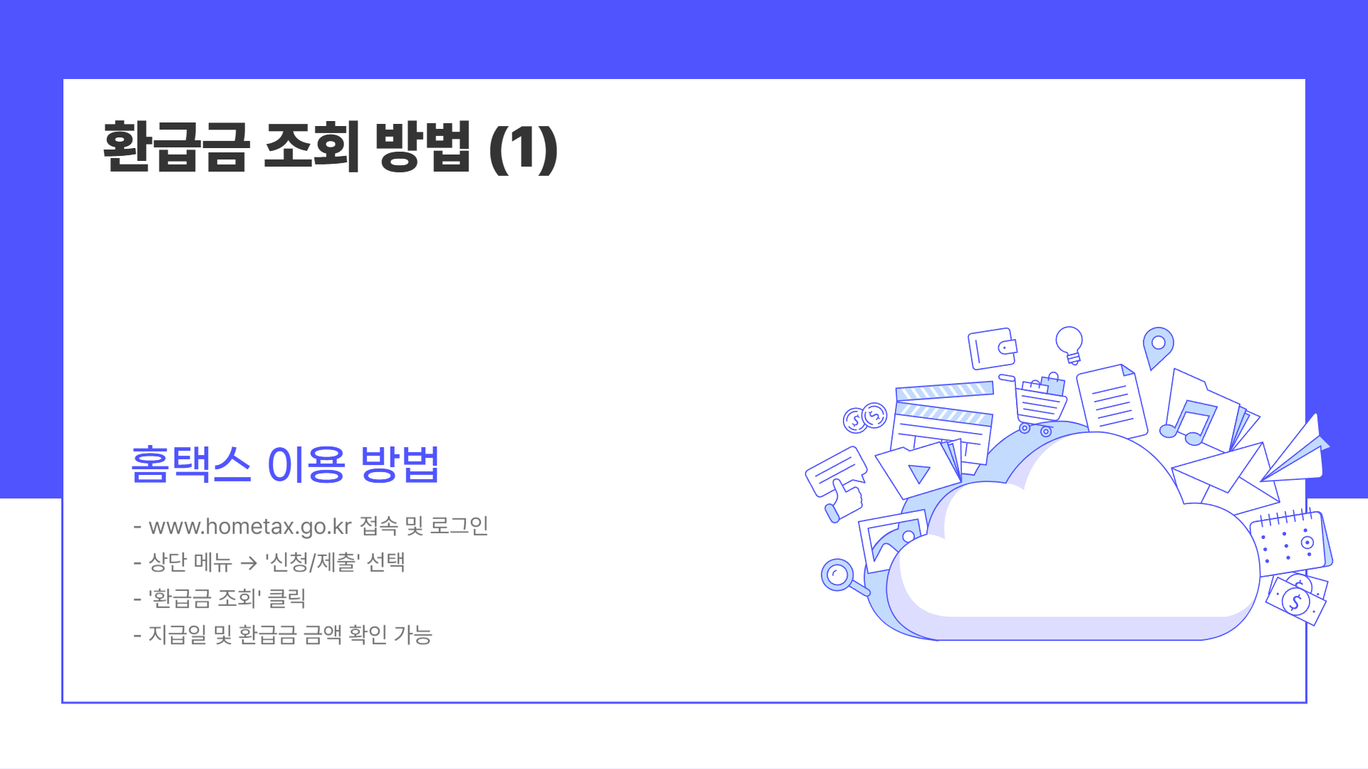- 환급금 지급일 예상: 신고 마감 후 30일 이내 지급일 통보