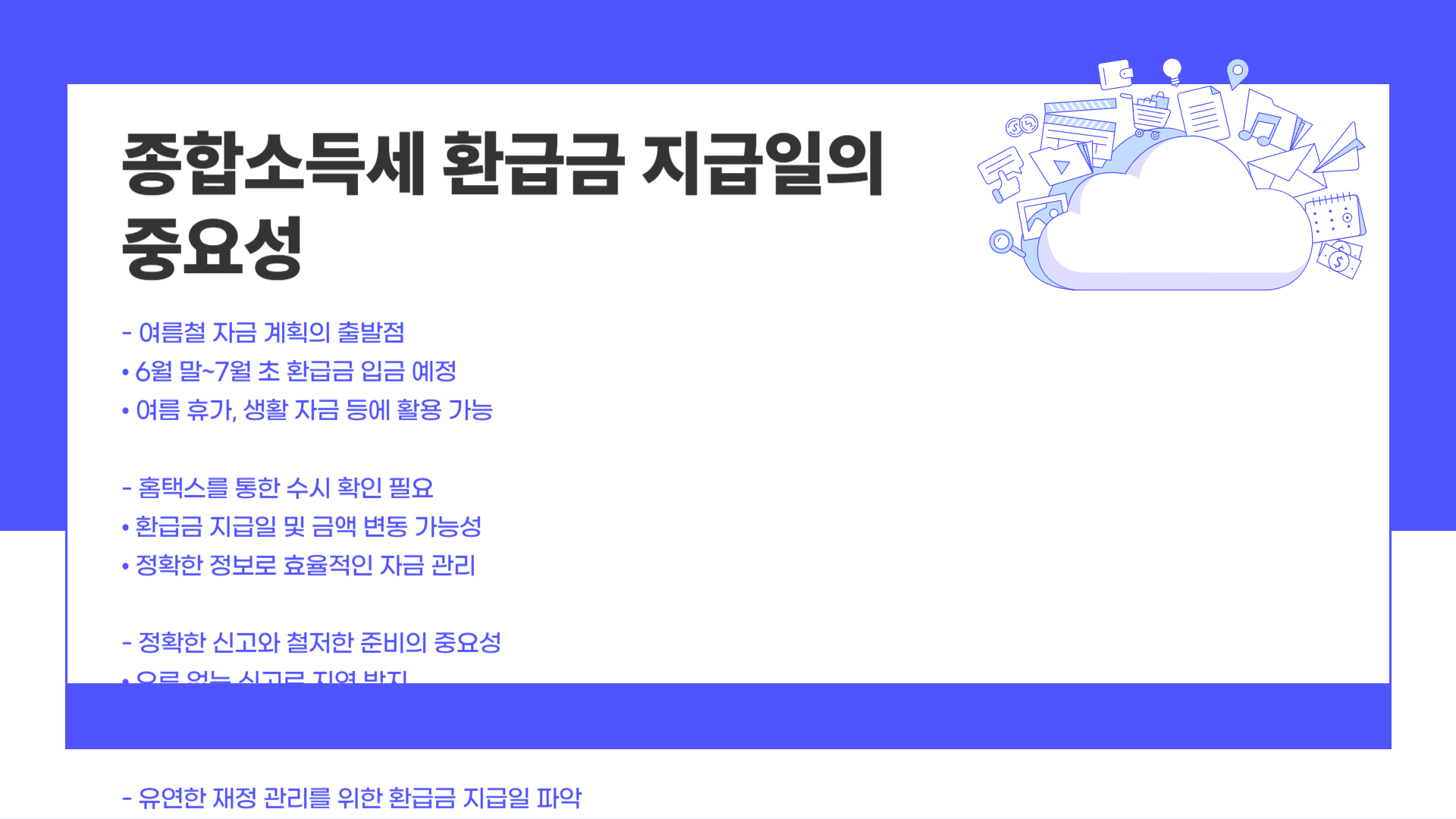 2025년 종합소득세 환급금 지급일은 단순한 세금 처리일이 아니라, 여름철 자금 계획의 출발점입니다.