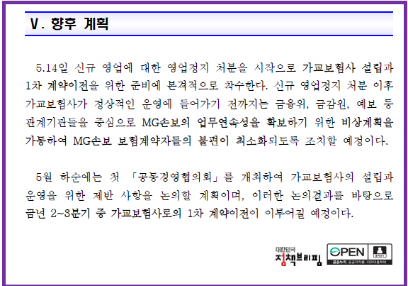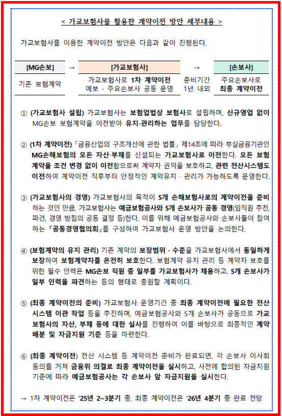 예금보험공사가 100% 출자해 MG손해보험 계약을 안정적으로 관리할 임시 보험사 설립. - 5대 손보사로 계약 이전: